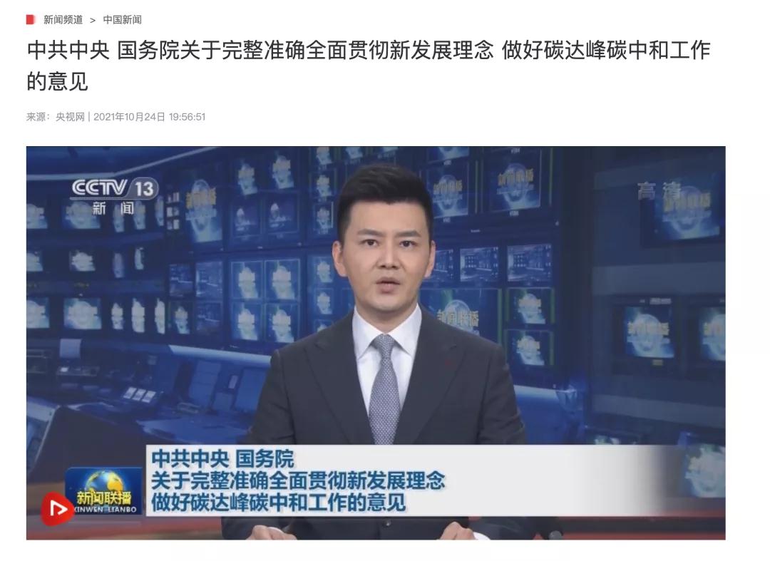 2021年10月24日,中共中央国务院发布《关于完整准确全面贯彻新发展理念做好碳达峰碳中和工作的意见》。