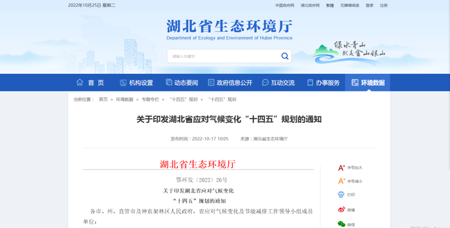 湖北省生态环境厅印发湖北省应对气候变化“十四五”规划的通知
