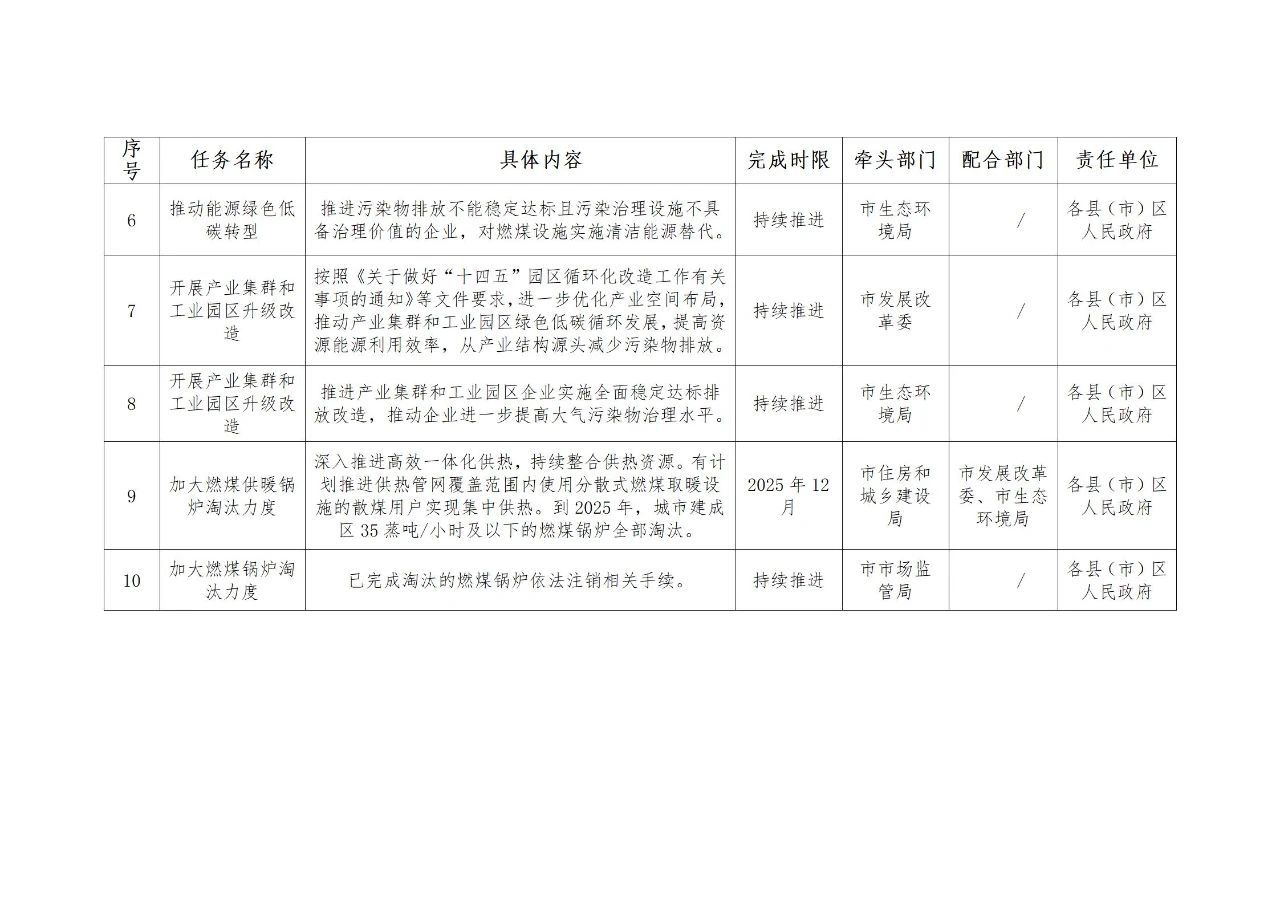 统筹大气污染防治与“双碳”目标要求,将打好重污染天气消除、臭氧污染防治和柴油货车污染治理三个标志性战役任务措施与降碳措施一体谋划、一体推进,优化调整产业、能源、运输结构,从源头减少大气污染物和碳排放,推进绿色低碳发展实现新突破。促进产业绿色转型升级,坚决遏制高耗能、高排放、低水平项目盲目发展,开展传统产业集群和工业园区升级改造。推动能源清洁低碳转型,开展散煤清洁化替代和供热管网覆盖范围内燃煤锅炉关停整合。构建绿色交通运输体系,坚持“车、油、路、企”统筹,以柴油货车和非道路移动机械为监管重点,聚焦煤炭、焦炭、矿石等大宗物料运输通道,坚持源头防控、过程防控和协同防控,加快推进“公转铁”,提高机动车和非道路移动机械绿色低碳水平。聚焦挥发性有机物(VOCs)、氮氧化物(NOx)等多污染物协同减排。以化工、涂装、制药、包装印刷和油品储运销等为重点,加强VOCs源头、无组织、末端全流程治理。高质量完成钢铁行业超低排放改造,推动玻璃、矿物棉、铸造、石灰、电石等行业深度治理。严把治理工程质量,多措并举治理低价中标乱象。统筹做好大气污染防治过程中安全防范工作。