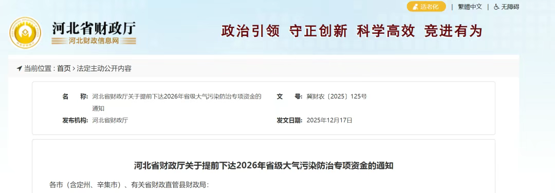 河北省财政厅关于提前下达2026年省级大气污染防治专项资金的通知